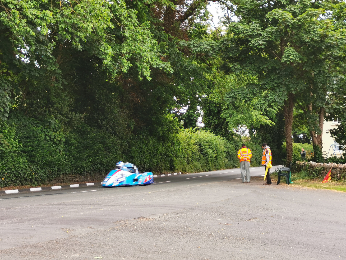 Der Mittwoch stand dann ganz im Zeichen der letzten Rennen, die wir noch sehen konnten, da am Donnerstag rennfrei war und am Freitag Morgen schon die Heimreise anstand. Gegen Mittag suchten wir zum Seitenwagenrennen über eine kleine Schotterstrasse den Abschnitt Wildpark auf. Von hier aus hatte man einen guten Blick auf die ankommenden Gespanne und die akrobatischen Übungen der Beiwagenfahrer. Wenn man sieht, bei welcher Geschwindigkeit, wie weit der sichere Beiwagen verlassen wird, kann man nur Respekt zollen. Wie auch immer, nach Abschluß des Rennens fuhren wir für das nächste Rennen über wiederum kleine Singleroads in die Nähe von Kirk Michael. Hier hatten wir einen guten Blick auf eine Kuppe, an der Piloten ihre Maschinen teilweise etwas versetzten, bevor sie ihre Stabilität zurück gewannen und damit auch die ursprüngliche Richtung. Auf jeden Fall spannend anzusehen. Auch dieses Rennen fand sein Ende, wieder einmal wie schon bei einigen Rennen dieser Woche, mit Michael Dunlop als Gewinner.