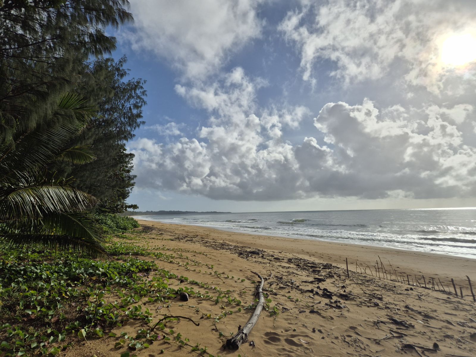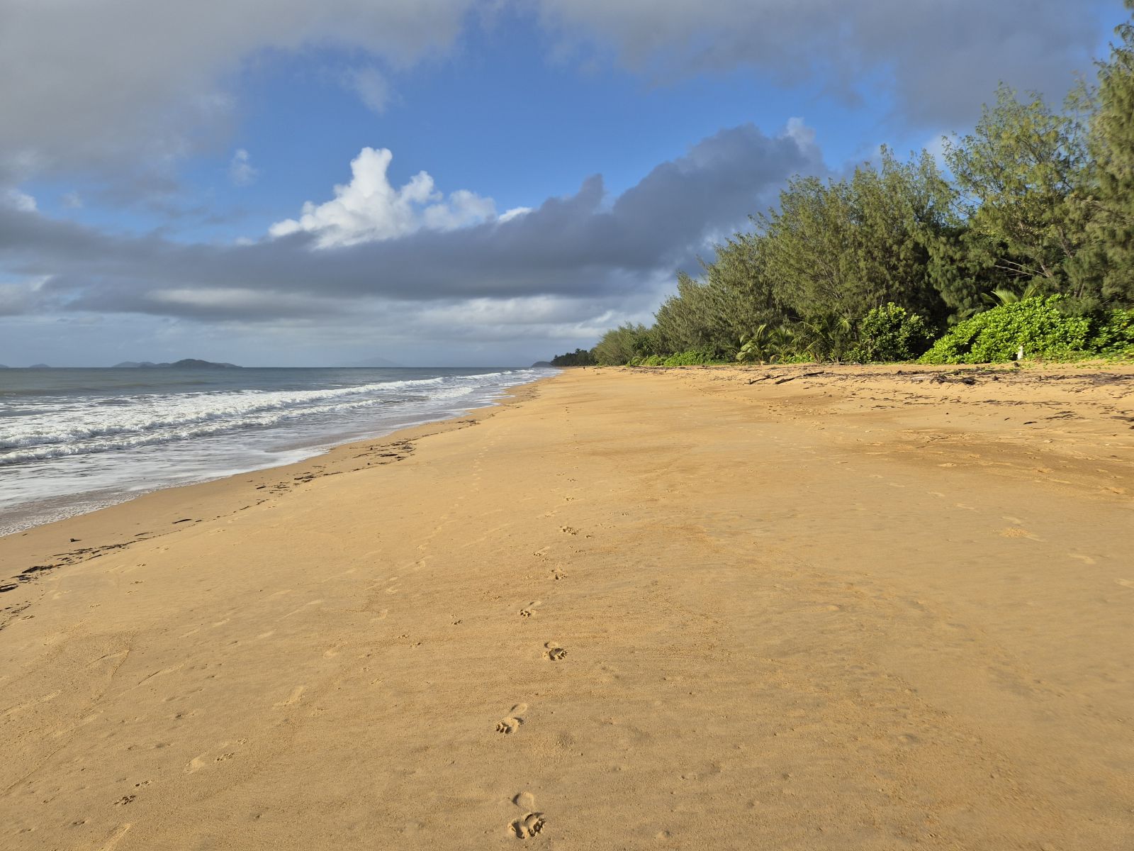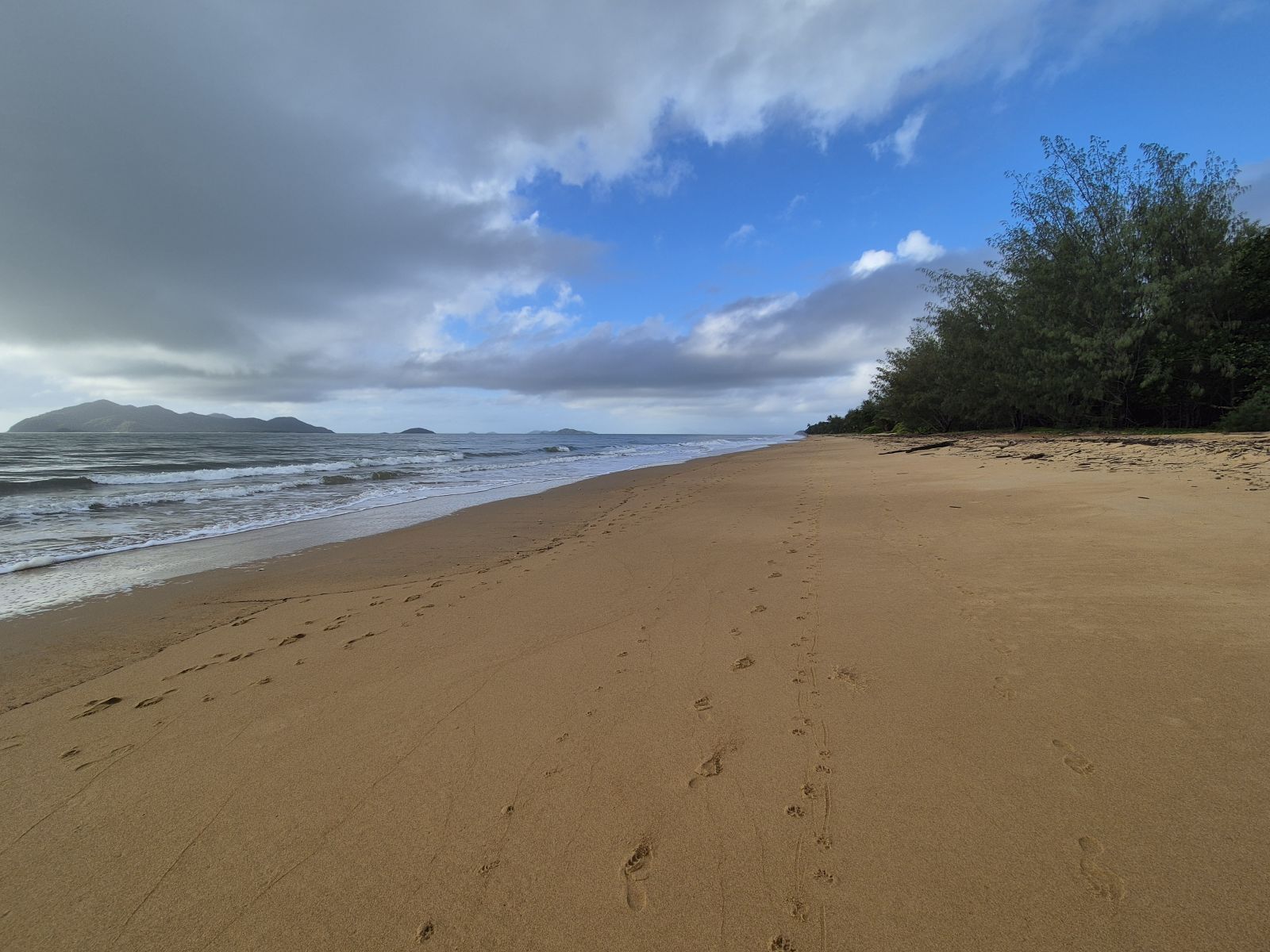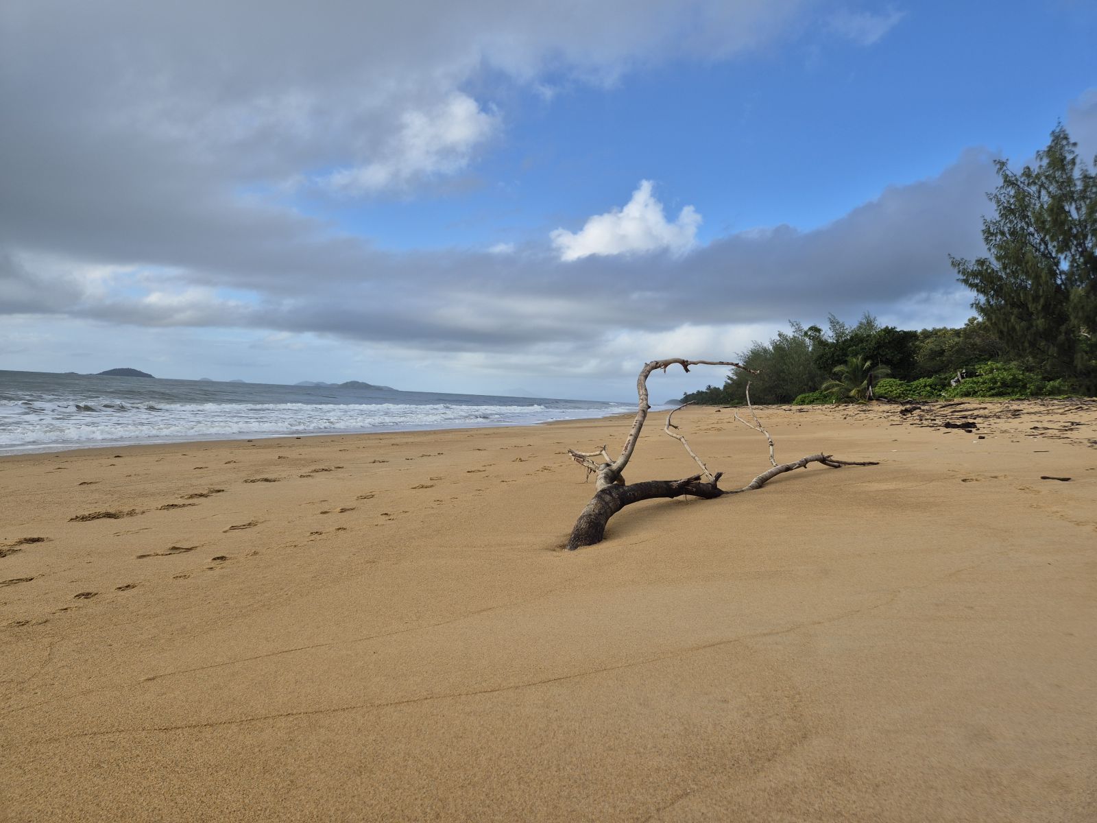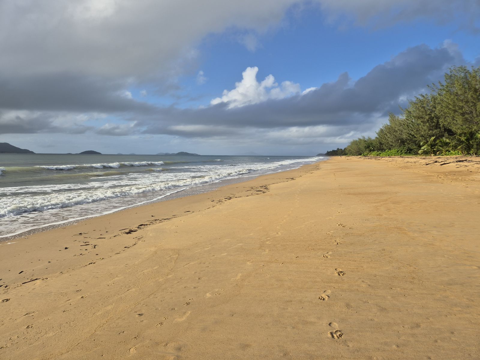 Für heute hatte ich den letzten Abschnitt vor mir. Ursprünglich war meine Planung, durch die Berge noch weiter in Richtung Norden zu fahren und dann über Cape Tribulation nach Cairns zu kommen. Ich hatte in den letzten Tagen allerdings bemerkt, das mein Aufnahmevermögen etwas erschöpft war, dazu kam dann noch, das gestern der Kofferträger am Motorrad gebrochen war und somit ein Koffer nur noch suboptimal befestigt war. Wie auch immer, dies hatte ich ja auch schon bei meinen letzten Touren bemerkt, wenn man merkt, das die Gedanken schon mehr auf der Heimfahrt als bei der eigentlichen Tour sind, dann kann man sich ruhig Gedanken über die Rückfahrt, in diesem Falle Rückflug machen. Und so tat ich es auch und buchte kurzentschlossen den Flug um auf ein früheres Datum. Nach dem Abschluß des gestrigen Tages mit Regen und feuchten Klamotten, die auch über Nacht nur minimal trockneten, hoffte ich, das der heutige Tag etwas besseres Motorradwetter bereit hielt. Und dem war tatsächlich so. Morgens schon blauer Himmel mit einigen Wolken. Das nutzte ich direkt zu einem Strandspaziergang in Mission Beach. Was für ein traumhafter langer Strand. Und nur ein paar Hundehalter, die ihre Kleinen ausführen. Da hat man wirklich seine Ruhe und kann ganz das Meer, den langen Strand und die Ruhe geniessen.