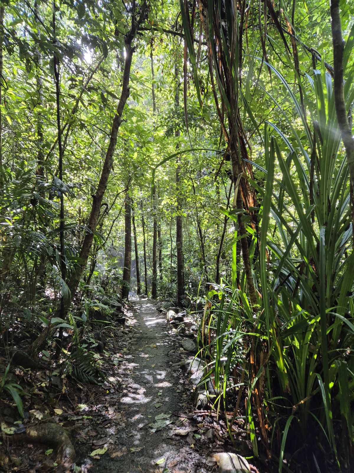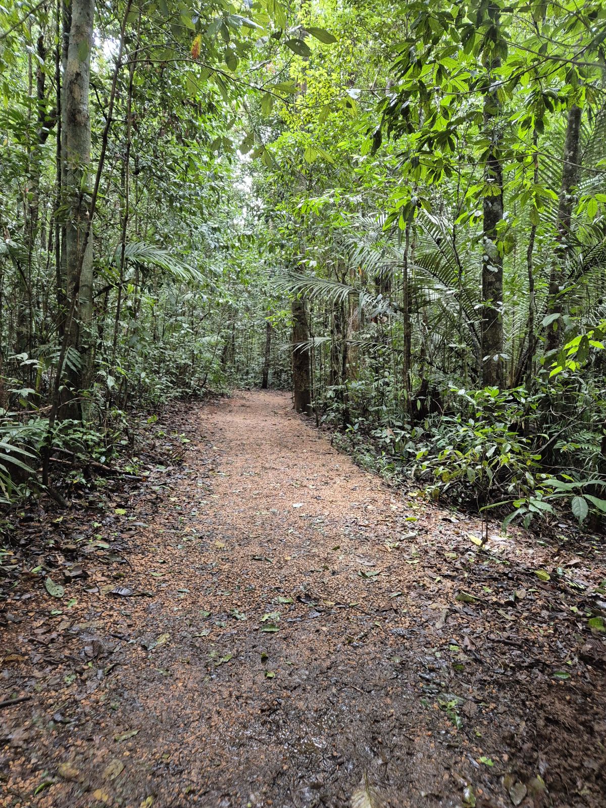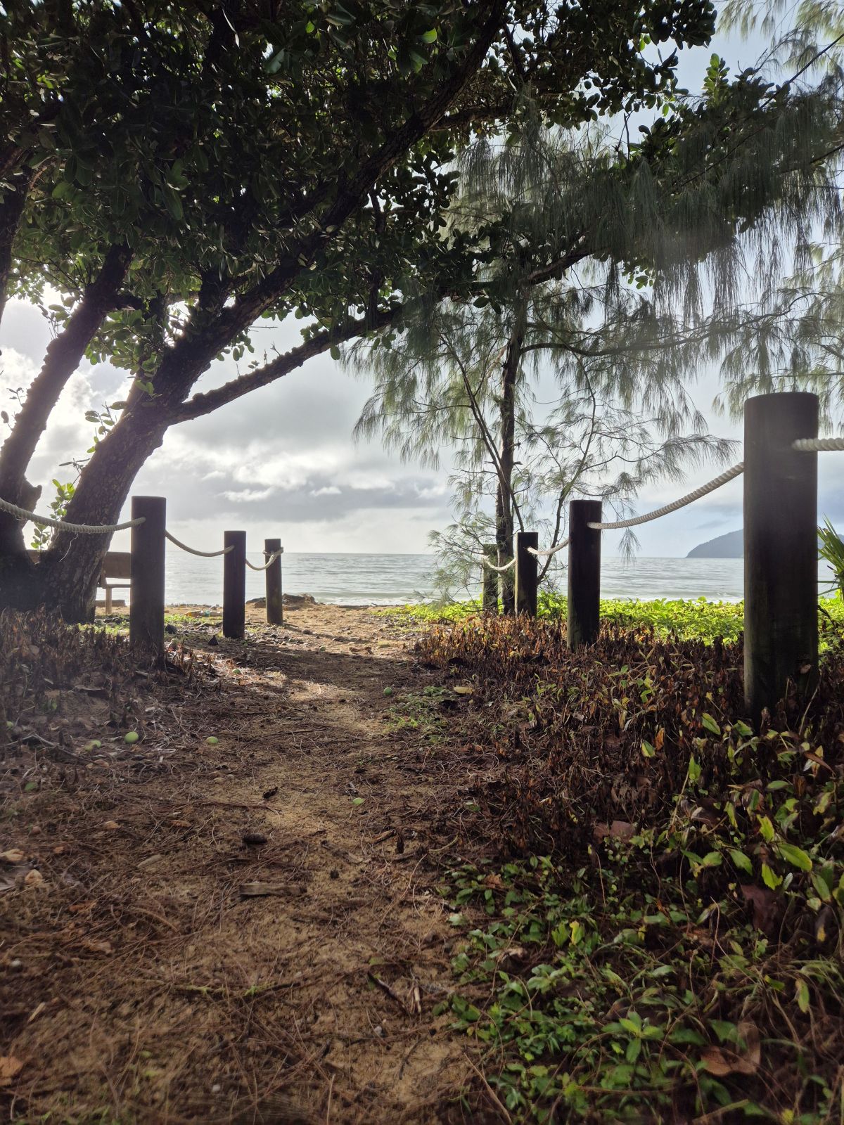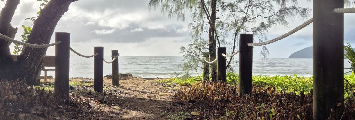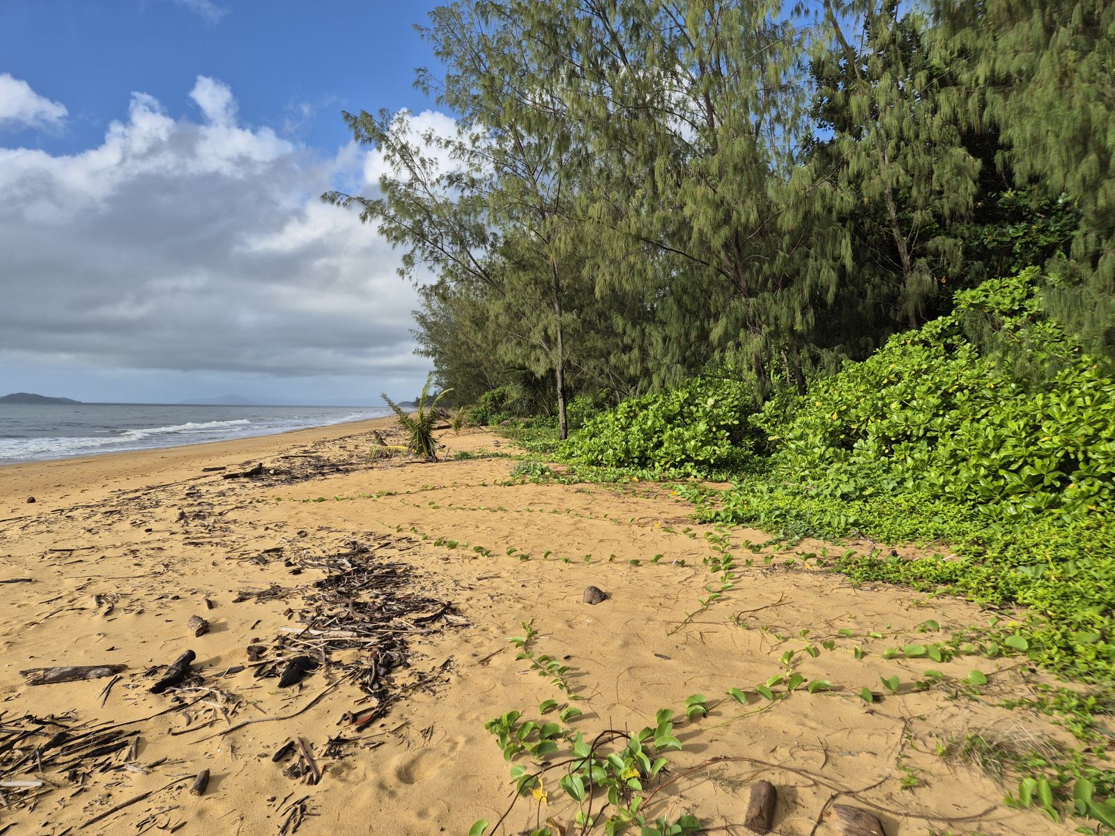 Für heute hatte ich den letzten Abschnitt vor mir. Ursprünglich war meine Planung, durch die Berge noch weiter in Richtung Norden zu fahren und dann über Cape Tribulation nach Cairns zu kommen. Ich hatte in den letzten Tagen allerdings bemerkt, das mein Aufnahmevermögen etwas erschöpft war, dazu kam dann noch, das gestern der Kofferträger am Motorrad gebrochen war und somit ein Koffer nur noch suboptimal befestigt war. Wie auch immer, dies hatte ich ja auch schon bei meinen letzten Touren bemerkt, wenn man merkt, das die Gedanken schon mehr auf der Heimfahrt als bei der eigentlichen Tour sind, dann kann man sich ruhig Gedanken über die Rückfahrt, in diesem Falle Rückflug machen. Und so tat ich es auch und buchte kurzentschlossen den Flug um auf ein früheres Datum. Nach dem Abschluß des gestrigen Tages mit Regen und feuchten Klamotten, die auch über Nacht nur minimal trockneten, hoffte ich, das der heutige Tag etwas besseres Motorradwetter bereit hielt. Und dem war tatsächlich so. Morgens schon blauer Himmel mit einigen Wolken. Das nutzte ich direkt zu einem Strandspaziergang in Mission Beach. Was für ein traumhafter langer Strand. Und nur ein paar Hundehalter, die ihre Kleinen ausführen. Da hat man wirklich seine Ruhe und kann ganz das Meer, den langen Strand und die Ruhe geniessen.