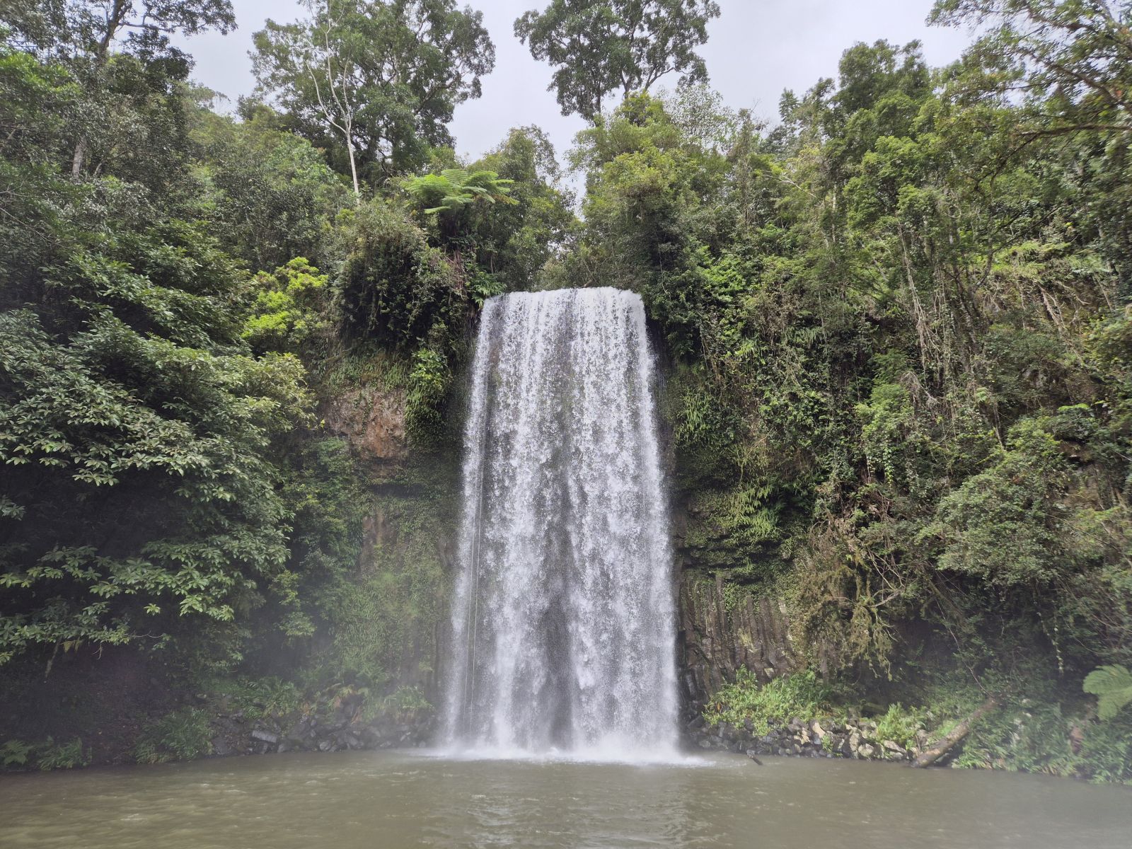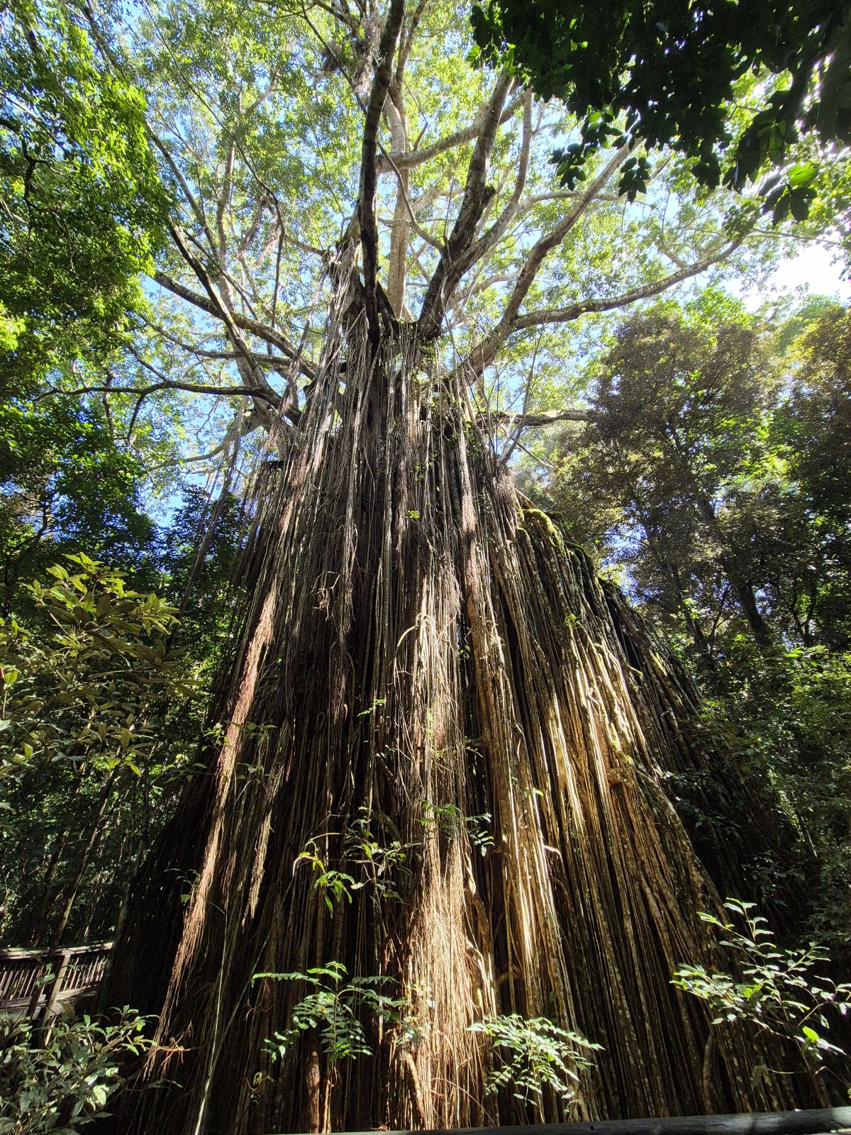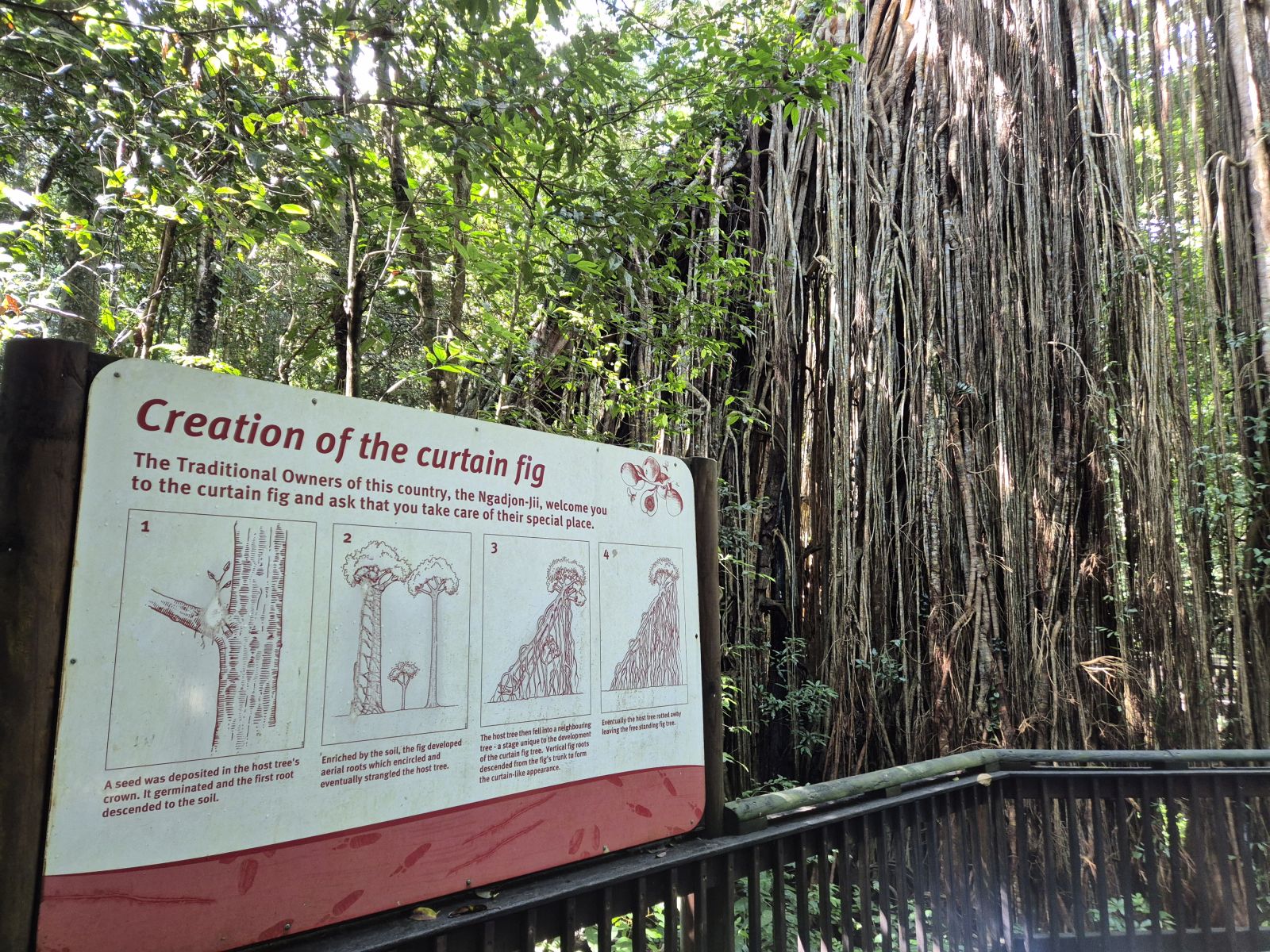 Irgendwann musste ich aber ja mal starten. Also riß ich mich los und trat die Weiterfahrt an. Zuerst eine kleine Runde durch Tully, die Heimat einiger Backpacker, die auf den umliegenden Bananenfarmen arbeiten. Danach ging es auf der A1 weiter Richtung Norden bis zur Abzweigung Richtung Milla Milla. Das war für heute das Ziel, damit die Natur auch nicht zu kurz kommt, der Waterfall Drive. Waren wir vor einigen Tagen noch zu zweit den Waterfall Way gefahren, war für mich heute ein anderer Weg, auch mit drei Wasserfällen an der Reihe. Diese Wasserfälle, darunter der Milla Milla Wasserfall als bekanntester, sollten den Weg wert. sein. Ich persönlich fand die Ellinja Falls, den ersten in der Reihe allerdings eindrucksvoller. Am eindruckvollsten finde ich immer noch den Wasserfall im Wollomombi Nationalpark, den wir dort gesehen hatten. Nachdem ich diese touristische Route hinter mir hatte, schlug ich den Weg in Richtung Yungaburra ein und machte am Curtain Fig Tree für einen kurzen Stop Halt. Schon beeindruckend was die Natur so alles auf die Beine oder auch in den Himmel wachsen lassen kann. Damit hatte ich die Naturwunder für diesen Tag auch genug gewürdigt.