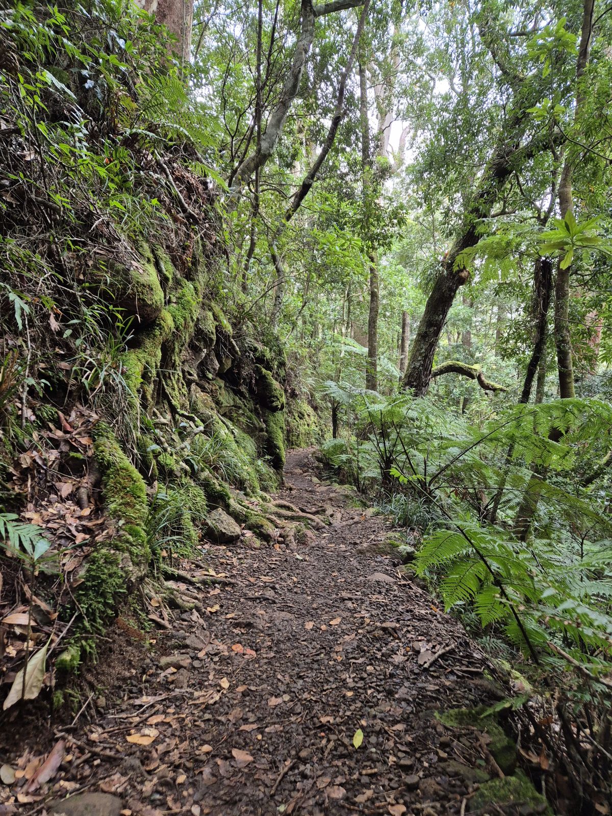 Nachdem wir heute ausgeschlafen hatten, machten wir uns gegen halb zehn auf den Weg zu einem Rundwanderweg durch den Nationalpark. Verschiedene Routen wurden vom Gastgeber vorgeschlagen, für uns machbar erschien ein 10 Kilometer Rundkurs, der direkt bei der Unterkunft startete und auch endete. Leider verfehlten wir den empfohlenen Beginn und begannen unsere Wanderung daher am Ende. So kamen uns im Laufe der nächsten Stunden einige Personen entgegen, die den Weg in der empfohlenen Richtung abliefen. Wir waren in der Hoffnung gestartet, das uns auch das ein oder Tier aus der heimischen Tierwelt begegnen würde, meiner Mitfahrerin hatte da im Speziellen Koalas im Sinn. Was dieses Ziel betraf, kehrten wir leider unverrichteter Dinge zurück. Dafür sahen wir Pflanzen und Bäume, die es so bei uns nicht gab und schon vom Wuchs und der Größe spektakulär aussahen. Wir kamen an mehreren Wasserfällen vorbei, bei denen der Wanderweg dann des öfteren auch den jeweiligen Bachlauf durchquerte. Gut, das die Schuhe wasserdicht waren und auch rutschfest, die Sprünge von Felsen zu Felsen im Bachbett wären mit Sneakern etwas schwieriger ausgefallen. Der Weg war ansonsten von wechselnder Qualität, mal trocken und leicht zu begehen und dann wieder verschlammt und herausfordernd bei jedem Schritt. Keine Überraschung bei den Regenfällen der letzten Zeit in dieser Region. Vier Stunden später hatten wir den Rundkurs hinter uns und legten eine kleine Pause im Zimmer ein.