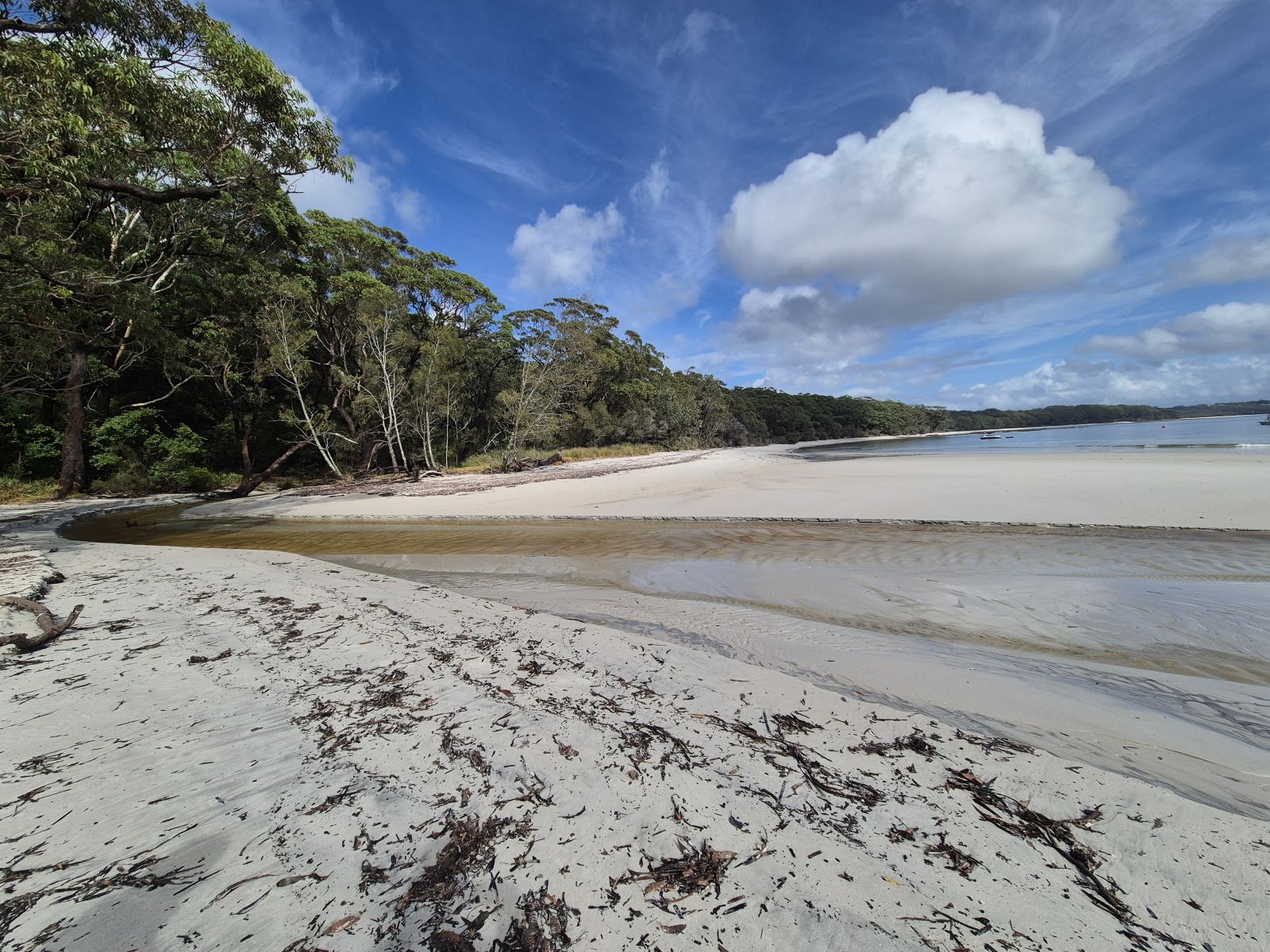 Nach dem Aufwachen stellten wir fest, das die zum trocknen aufgehängten Sachen immer noch annähernd genauso naß waren wie am Vorabend. Auch die Handtücher, die wir nach dem Duschen an Vortag benutzt hatten, waren noch genauso feucht wie nach dem Abtrocknen. Musste wohl irgendwas mit der Luftfeuchtigkeit zu tun haben... Also alle nassen Sachen, die wir zum Fahren benötigten wieder anziehen und die anderen einfach ins Gepäck stopfen. Das erste Etappenziel für den heutigen Tag war der Nationalpark Jervis Bay, den wir nach ca. einer Stunde erreichten. Dort erwartete uns ein urwüchsiger Urwald und da Jervis Bay auf einer Halbinsel liegt, machten wir natürlich auch ein paar Schritte an den Strand. Das Wetter für den heutigen Tag versprach tatsächlich trocken zu bleiben und auf Jervis Bay hatten wir auch schon deutlich über 20 Grad. Mit den noch leicht feuchten Klamotten war es naturgemäß richtig schön, da diese nun nach innen und außen ihre Feuchtigkeit abgaben.